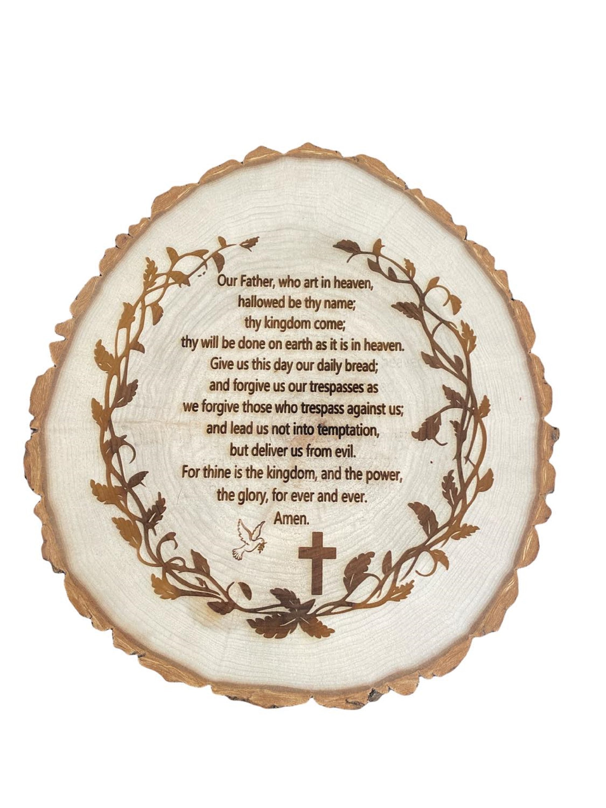 Lord's Prayer engraved on one of our beautiful kiln dried Wood Slices. Approx measurements are 9"-11" D x 1" Thick.