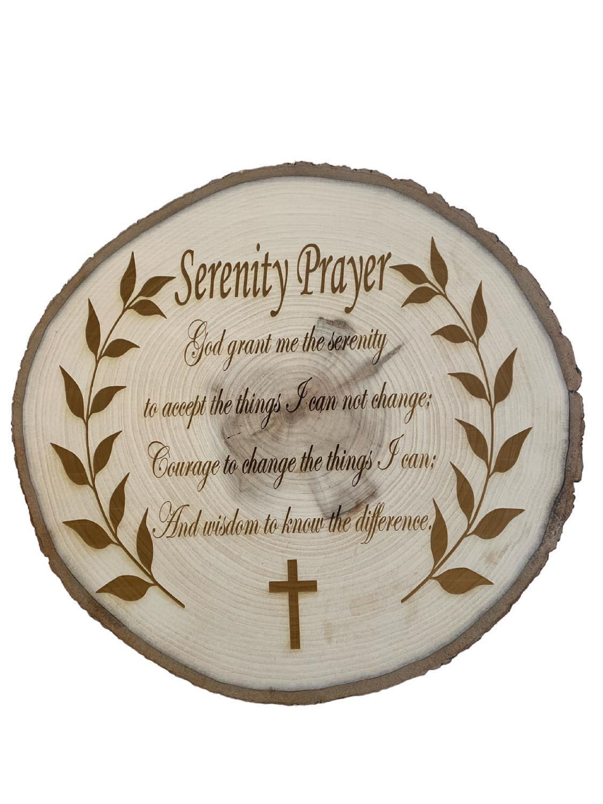 Serenity Prayer engraved on one of our beautiful kiln dried Wood Slices. Approx measurements are 9"-11" D x 1" Thick.